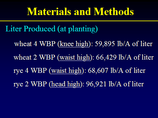 Materials and Methods<BR>Liter Produced (at planting) <BR>    wheat 4 WBP (knee high): 59,895 lb/A of liter <BR>	wheat 2 WBP (waist high): 66,429 lb/A of liter <BR>	rye 4 WBP (waist high): 68,607 lb/A of liter <BR>	rye 2 WBP (head high): 96,921 lb/A of liter<BR>