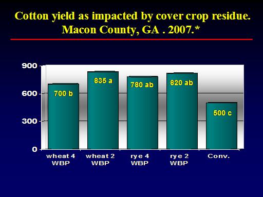 Cotton yield as impacted by cover crop residue.  Macon County, GA . 2007.*<BR>700 b<BR>780 ab<BR>835 a<BR> 500 c<BR>820 ab<BR>
