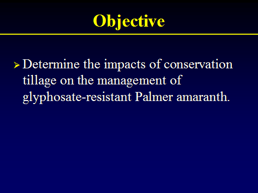 Objective<BR>Determine the impacts of conservation tillage on the management of glyphosate-resistant Palmer amaranth.<BR>