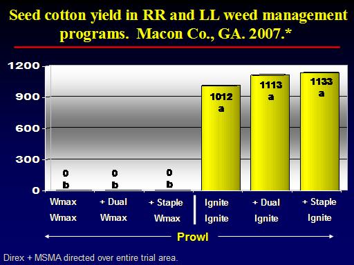 Direx + MSMA directed over entire trial area.<BR> Seed cotton yield in RR and LL weed management programs.  Macon Co., GA. 2007.*<BR>+ Dual <BR>Wmax<BR>+ Staple <BR> Wmax<BR>1113 a<BR>Prowl<BR>0 b<BR>0 b<BR>0 b<BR>1012 a<BR>1133a<BR>Wmax <BR>Wmax <BR>Ignite <BR>Ignite <BR>+ Dual <BR>Ignite <BR>+ Staple <BR>Ignite <BR>