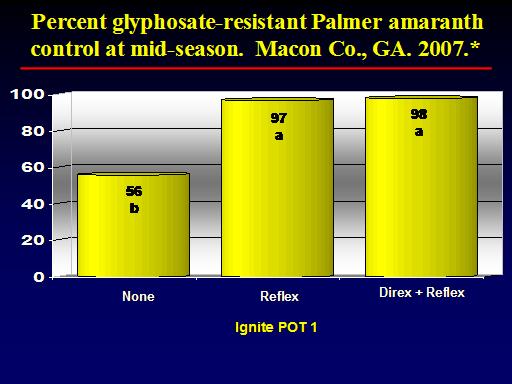 56 b<BR>97 a<BR>98 a<BR>None <BR>Direx + Reflex <BR>Reflex <BR> Percent glyphosate-resistant Palmer amaranth control at mid-season.  Macon Co., GA. 2007.*<BR>Ignite POT 1<BR>