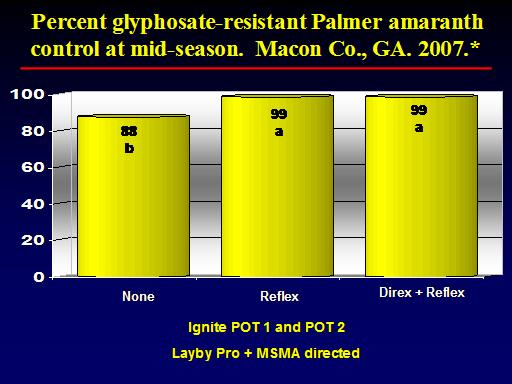 88 b<BR>99 a<BR>99 a<BR>None <BR>Direx + Reflex <BR>Reflex <BR> Percent glyphosate-resistant Palmer amaranth control at mid-season.  Macon Co., GA. 2007.*<BR>Ignite POT 1 and POT 2 <BR>Layby Pro + MSMA directed<BR>