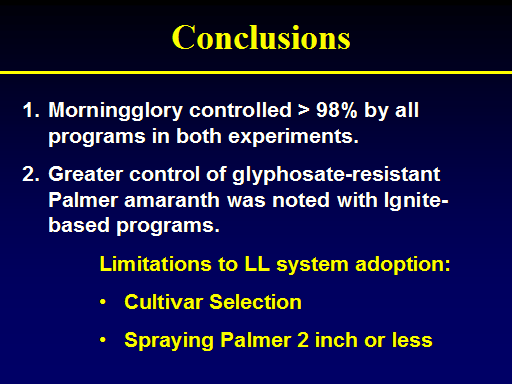 Conclusions<BR>Morningglory controlled > 98% by all programs in both experiments. <BR>Greater control of glyphosate-resistant Palmer amaranth was noted with Ignite-based programs.  <BR>Limitations to LL system adoption:   <BR>Cultivar Selection <BR>Spraying Palmer 2 inch or less<BR>