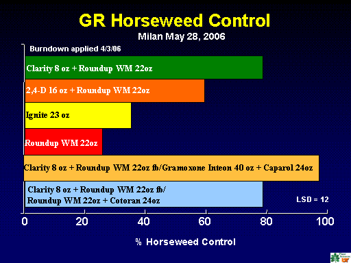 GR Horseweed Control <BR>0<BR>20<BR>40<BR>60<BR>80<BR>100<BR>Roundup WM 22oz <BR>Clarity 8 oz + Roundup WM 22oz <BR>Ignite 23 oz<BR>LSD = 12<BR>% Horseweed Control<BR>Milan May 28, 2006<BR>2,4-D 16 oz + Roundup WM 22oz <BR>Burndown applied 4/3/06<BR>Clarity 8 oz + Roundup WM 22oz fb/Gramoxone Inteon 40 oz + Caparol 24oz <BR>Clarity 8 oz + Roundup WM 22oz fb/ <BR>Roundup WM 22oz + Cotoran 24oz <BR>