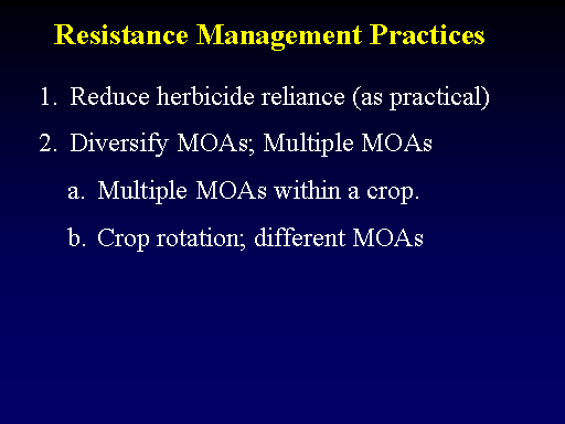 Resistance Management Practices <BR>Reduce herbicide reliance (as practical) <BR>2.	Diversify MOAs; Multiple MOAs <BR>Multiple MOAs within a crop.  <BR>Crop rotation; different MOAs <BR> <BR> <BR> <BR> <BR>