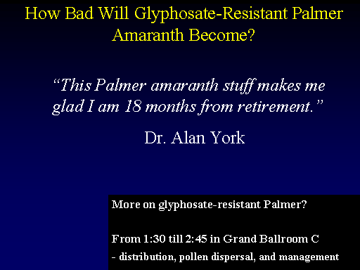 More on glyphosate-resistant Palmer? <BR> <BR>From 1:30 till 2:45 in Grand Ballroom C <BR>- distribution, pollen dispersal, and management<BR>How Bad Will Glyphosate-Resistant Palmer Amaranth Become?<BR>“This Palmer amaranth stuff makes me glad I am 18 months from retirement.”  <BR>   Dr. Alan York<BR>