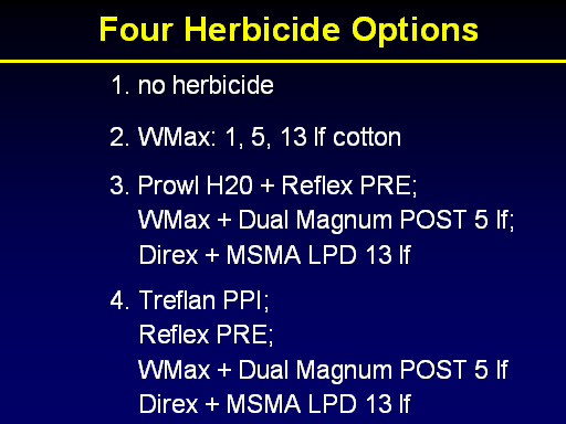 Four Herbicide Options<BR>no herbicide <BR> <BR>WMax: 1, 5, 13 lf cotton <BR> <BR>3. Prowl H20 + Reflex PRE;  <BR>	WMax + Dual Magnum POST 5 lf;  <BR>	Direx + MSMA LPD 13 lf <BR>  <BR>Treflan PPI; <BR>	Reflex PRE; <BR>	WMax + Dual Magnum POST 5 lf <BR>	Direx + MSMA LPD 13 lf	<BR>
