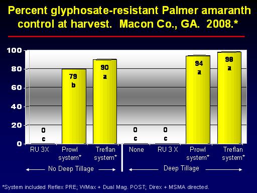 *System included Reflex PRE; WMax + Dual Mag. POST; Direx + MSMA directed.<BR> Percent glyphosate-resistant Palmer amaranth control at harvest.  Macon Co., GA.  2008.*<BR>0 c<BR>Prowl system*<BR>None<BR>Prowl system*<BR>Treflan system*<BR>Treflan system*<BR>No Deep Tillage<BR>0 c<BR>79b<BR>90 a<BR>0 c<BR>Deep Tillage<BR>RU 3X <BR>RU 3 X<BR>98 a<BR>94 a<BR>