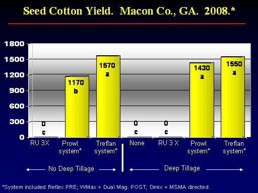 *System included Reflex PRE; WMax + Dual Mag. POST; Direx + MSMA directed.<BR> Seed Cotton Yield.  Macon Co., GA.  2008.*<BR>0 c<BR>Prowl system*<BR>None<BR>Prowl system*<BR>Treflan system*<BR>Treflan system*<BR>No Deep Tillage<BR>0 c<BR>1170 b<BR>1570 a<BR>0 c<BR>Deep Tillage<BR>RU 3X <BR>RU 3 X<BR>1430 a<BR>1550 a<BR>