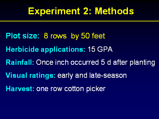 Experiment 2: Methods<BR>Plot size:  8 rows  by 50 feet <BR>Herbicide applications: 15 GPA <BR>Rainfall: Once inch occurred 5 d after planting <BR>Visual ratings: early and late-season <BR>Harvest: one row cotton picker<BR>