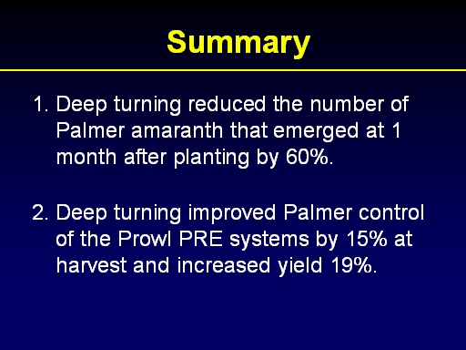 Summary<BR>Deep turning reduced the number of Palmer amaranth that emerged at 1 month after planting by 60%. <BR> <BR>Deep turning improved Palmer control of the Prowl PRE systems by 15% at harvest and increased yield 19%.<BR>