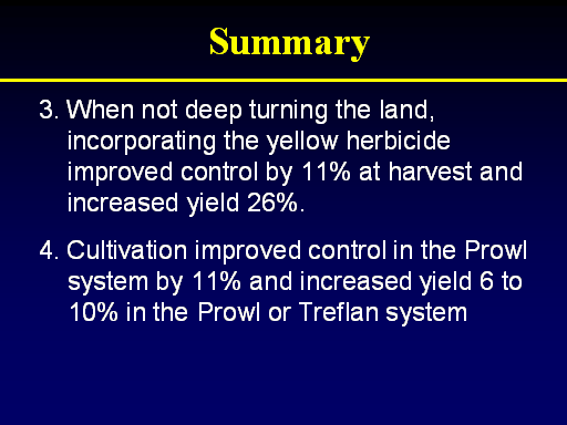 Summary<BR>3. When not deep turning the land, incorporating the yellow herbicide improved control by 11% at harvest and increased yield 26%. <BR>4. Cultivation improved control in the Prowl system by 11% and increased yield 6 to 10% in the Prowl or Treflan system<BR>