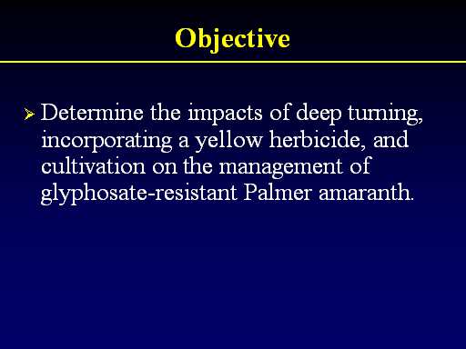 Objective<BR>Determine the impacts of deep turning, incorporating a yellow herbicide, and cultivation on the management of glyphosate-resistant Palmer amaranth.<BR>