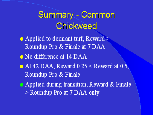 <LI><H2>Applied to dormant turf, Reward > Roundup Pro & Finale at 7 DAA