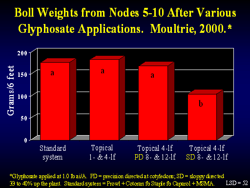 *Glyphosate applied at 1.0 lb ai/A.  PD = precision directed at cotyledons; SD = sloppy directed 33 to 40% up the plant.  Standard system = Prowl + Cotoran fb Staple fb Caparol + MSMA.</UL></P>