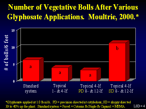 *Glyphosate applied at 1.0 lb ai/A.  PD = precision directed at cotyledons; SD = sloppy directed 33 to 40% up the plant.  Standard system = Prowl + Cotoran fb Staple fb Caparol + MSMA.</UL></P>