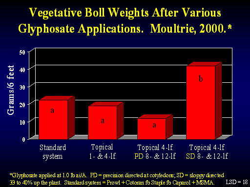 *Glyphosate applied at 1.0 lb ai/A.  PD = precision directed at cotyledons; SD = sloppy directed 33 to 40% up the plant.  Standard system = Prowl + Cotoran fb Staple fb Caparol + MSMA.</UL></P>