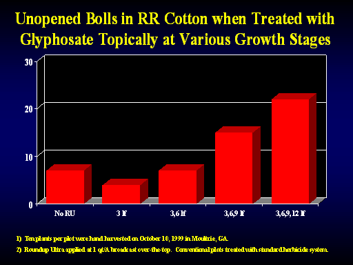 Unopened Bolls in RR Cotton when Treated with Glyphosate Topically at Various Growth Stages </UL></P>