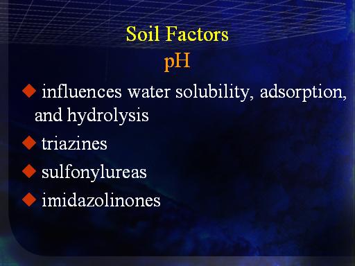 Soil FactorspH<BR> influences water solubility, adsorption, and hydrolysis