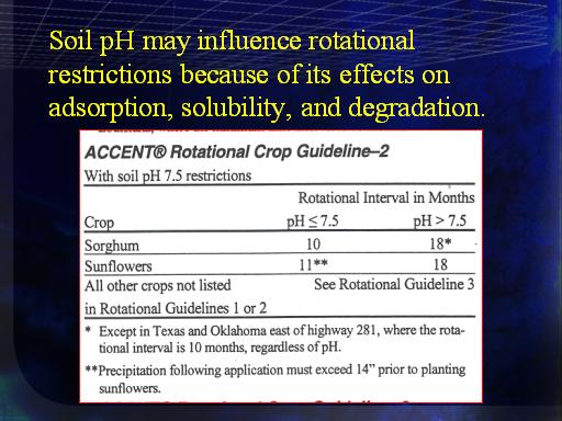 Soil pH may influence rotational restrictions because of its effects on adsorption, solubility, and degradation.<BR>