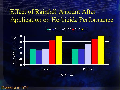 Effect of Rainfall Amount After Application on Herbicide Performance<BR>Simmons et al. 1997 <BR>