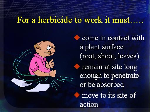 For a herbicide to work it must…..<BR> come in contact with a plant surface            (root, shoot, leaves)