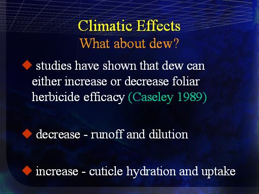 Climatic EffectsWhat about dew?<BR> studies have shown that dew can either increase or decrease foliar herbicide efficacy (Caseley 1989)
