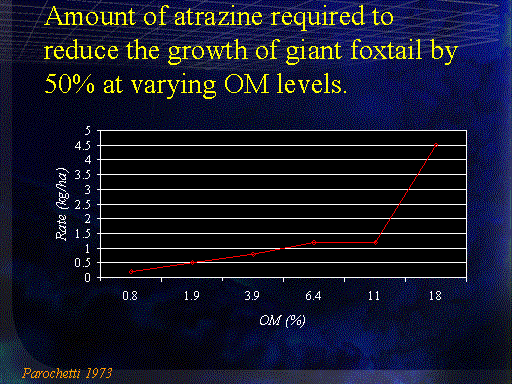 Amount of atrazine required to reduce the growth of giant foxtail by 50% at varying OM levels.<BR>Parochetti 1973<BR>