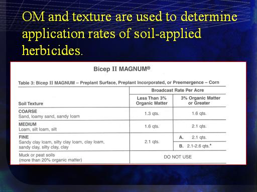 OM and texture are used to determine application rates of soil-applied herbicides.<BR>