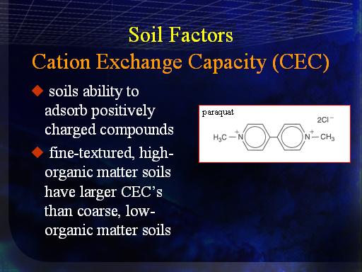 <BR> fine-textured, high-organic matter soils have larger CEC’s than coarse, low-organic matter soils<BR>paraquat<BR>