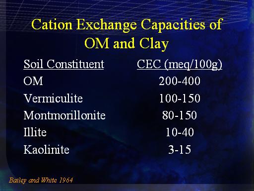 Cation Exchange Capacities of OM and Clay<BR>Bailey and White 1964<BR>