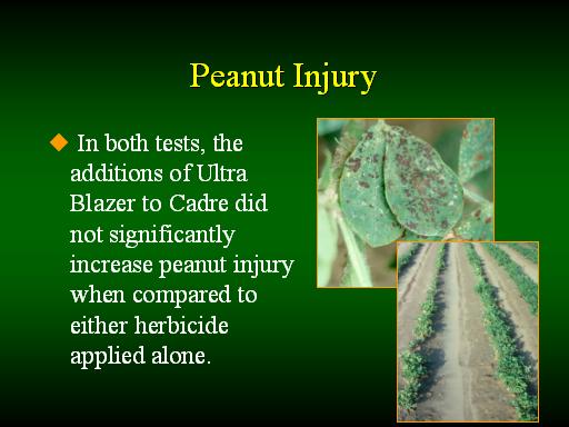 Peanut Injury<BR> In both tests, the additions of Ultra Blazer to Cadre did not significantly increase peanut injury when compared to either herbicide applied alone.<BR>