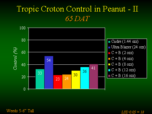 Tropic Croton Control in Peanut - II65 DAT<BR>Weeds 5-6” Tall<BR>LSD 0.05 = 18<BR>