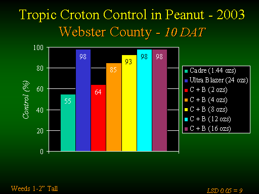 Tropic Croton Control in Peanut - 2003Webster County - 10 DAT<BR>Weeds 1-2” Tall<BR>LSD 0.05 = 9<BR>