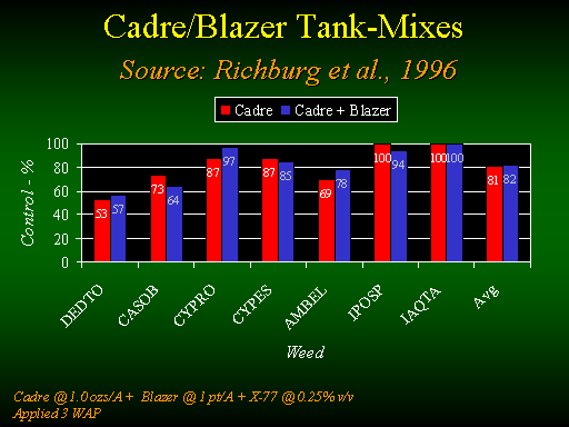 Cadre/Blazer Tank-Mixes Source: Richburg et al., 1996<BR>Cadre @ 1.0 ozs/A +  Blazer @ 1 pt/A + X-77 @ 0.25% v/v
