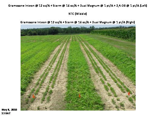 Gramoxone Inteon @ 12 oz/A + Storm @ 16 oz/A + Dual Magnum @ 1 pt/A + 2,4-DB @ 1 pt/A (Left) <BR> <BR>NTC (Middle) <BR> <BR>Gramoxone Inteon @ 12 oz/A + Storm @ 16 oz/A + Dual Magnum @ 1 pt/A (Right)<BR>May 8, 2010 <BR>13 DAT<BR>