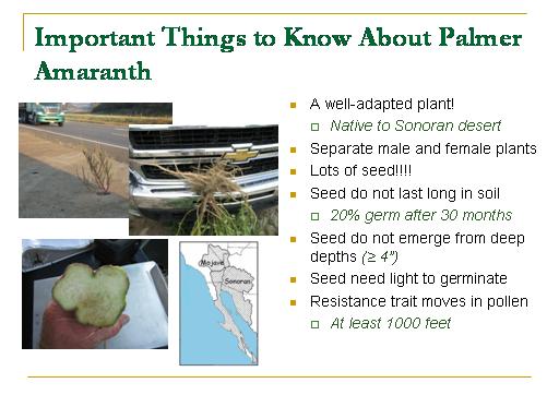 Important Things to Know About Palmer Amaranth<BR>A well-adapted plant! <BR>Native to Sonoran desert <BR>Separate male and female plants <BR>Lots of seed!!!! <BR>Seed do not last long in soil <BR>20% germ after 30 months <BR>Seed do not emerge from deep depths (= 4”) <BR>Seed need light to germinate <BR>Resistance trait moves in pollen <BR>At least 1000 feet<BR>
