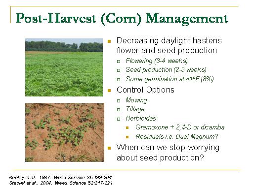 Post-Harvest (Corn) Management<BR>Decreasing daylight hastens flower and seed production <BR>Flowering (3-4 weeks) <BR>Seed production (2-3 weeks) <BR>Some germination at 410F (8%) <BR>Control Options <BR>Mowing <BR>Tillage <BR>Herbicides <BR>Gramoxone + 2,4-D or dicamba <BR>Residuals i.e. Dual Magnum? <BR>When can we stop worrying about seed production? <BR>Keeley et al.  1987.  Weed Science 35:199-204  <BR>Steckel et al., 2004.  Weed Science 52:217-221 <BR>