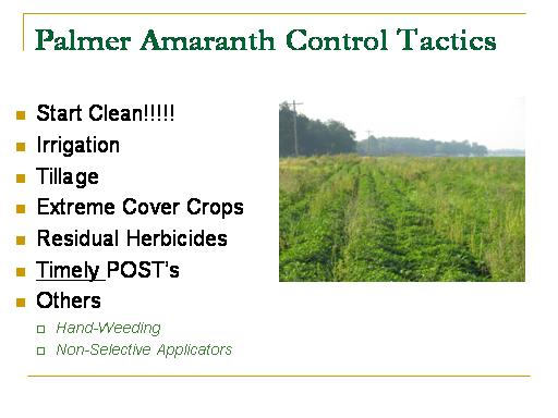 Palmer Amaranth Control Tactics<BR>Start Clean!!!!! <BR>Irrigation <BR>Tillage <BR>Extreme Cover Crops <BR>Residual Herbicides <BR>Timely POST’s <BR>Others <BR>Hand-Weeding <BR>Non-Selective Applicators<BR>