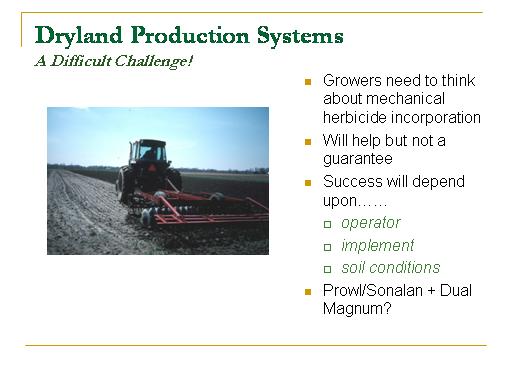 Dryland Production Systems A Difficult Challenge!<BR>Growers need to think about mechanical herbicide incorporation <BR>Will help but not a  guarantee <BR>Success will depend upon…… <BR>operator <BR>implement <BR>soil conditions <BR>Prowl/Sonalan + Dual Magnum? <BR>