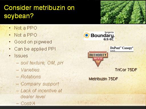 Consider metribuzin on soybean?<BR>Not a PPO <BR>Not a PPO <BR>Good on pigweed <BR>Can be applied PPI <BR>Issues <BR>soil texture, OM, pH <BR>Varieties <BR>Rotations <BR>Company support <BR>Lack of incentive at dealer level <BR>Cost/A<BR>TriCor 75DF<BR>Metribuzin 75DF<BR>
