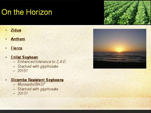 On the Horizon<BR>Zidua <BR> <BR>Anthem <BR> <BR>Fierce <BR> <BR>Enlist Soybean  <BR>Enhanced tolerance to 2,4-D <BR>Stacked with glyphosate <BR>2015? <BR> <BR>Dicamba Resistant Soybeans <BR>Monsanto/BASF <BR>Stacked with glyphosate <BR>2013? <BR> <BR> <BR>