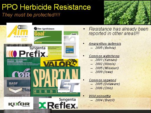 PPO Herbicide Resistance They must be protected!!!!<BR>Resistance has already been reported in other areas!!! <BR> <BR>Amaranthus quitensis <BR>2005 (Bolivia) <BR> <BR>Common waterhemp <BR>2001 (Kansas) <BR>2002 (Illinois) <BR>2005 (Missouri) <BR>2009 (Iowa) <BR> <BR>Common ragweed <BR>2005 (Delaware) <BR>2006 (Ohio) <BR> <BR>Wild poinsettia <BR>2004 (Brazil) <BR> <BR> <BR> <BR>