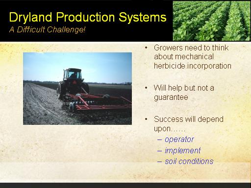 Dryland Production Systems A Difficult Challenge!<BR>Growers need to think about mechanical herbicide incorporation <BR> <BR>Will help but not a  guarantee <BR> <BR>Success will depend upon…… <BR>operator <BR>implement <BR>soil conditions<BR>