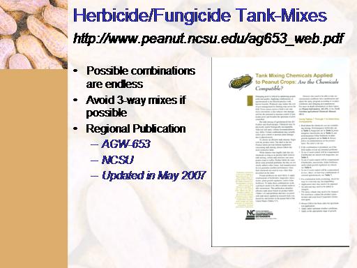 Herbicide/Fungicide Tank-Mixes http://www.peanut.ncsu.edu/ag653_web.pdf <BR>Possible combinations are endless <BR>Avoid 3-way mixes if possible <BR>Regional Publication <BR>AGW-653 <BR>NCSU <BR>Updated in May 2007<BR>