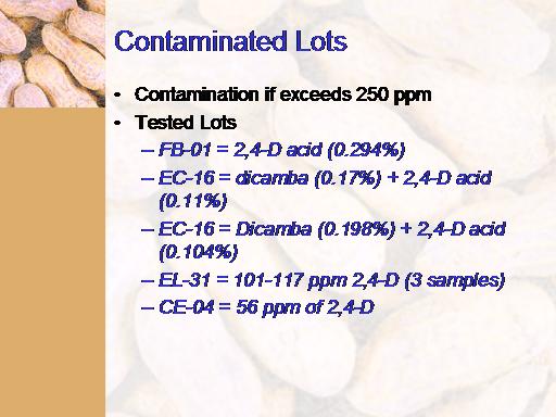 Contaminated Lots<BR>Contamination if exceeds 250 ppm <BR>Tested Lots <BR>FB-01 = 2,4-D acid (0.294%) <BR>EC-16 = dicamba (0.17%) + 2,4-D acid (0.11%) <BR>EC-16 = Dicamba (0.198%) + 2,4-D acid (0.104%) <BR>EL-31 = 101-117 ppm 2,4-D (3 samples) <BR>CE-04 = 56 ppm of 2,4-D <BR>