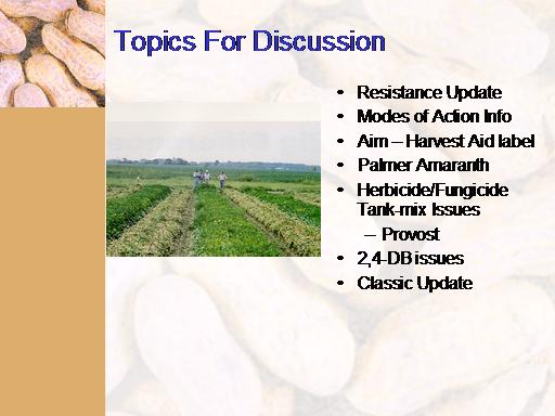 Topics For Discussion<BR>Resistance Update <BR>Modes of Action Info <BR>Aim – Harvest Aid label <BR>Palmer Amaranth <BR>Herbicide/Fungicide Tank-mix Issues <BR>Provost <BR>2,4-DB issues <BR>Classic Update <BR>