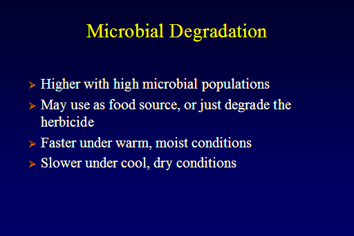 Microbial Degradation<BR>Higher with high microbial populations <BR>May use as food source, or just degrade the herbicide <BR>Faster under warm, moist conditions <BR>Slower under cool, dry conditions<BR>