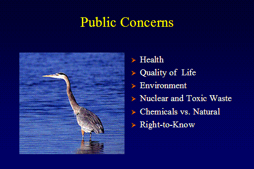 Public Concerns<BR>Health <BR>Quality of  Life <BR>Environment <BR>Nuclear and Toxic Waste <BR>Chemicals vs. Natural <BR>Right-to-Know <BR>