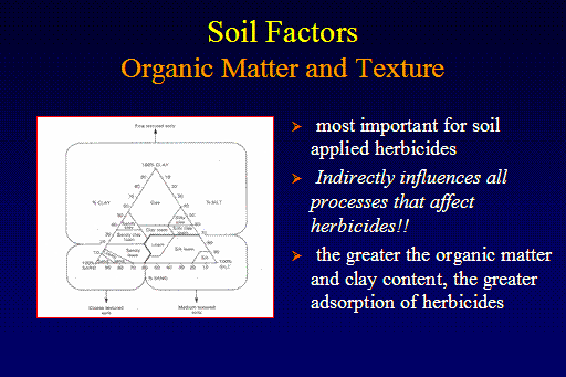 Soil Factors Organic Matter and Texture<BR> most important for soil applied herbicides <BR> Indirectly influences all processes that affect herbicides!! <BR> the greater the organic matter and clay content, the greater adsorption of herbicides<BR>